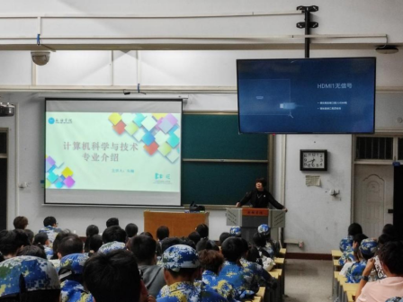 计算机科学与技术专业负责人朱楠老师介绍了计算机科学与技术专业的课程内容,包括程序设计基础、数据结构、算法分析等核心课程,并介绍了该专业的师资力量和实践教学环节。朱老师还向新生们展示了该专业毕业生的就业方向,包括Web前端、网络等多个领域。