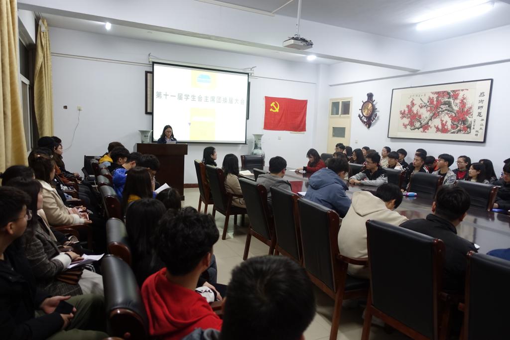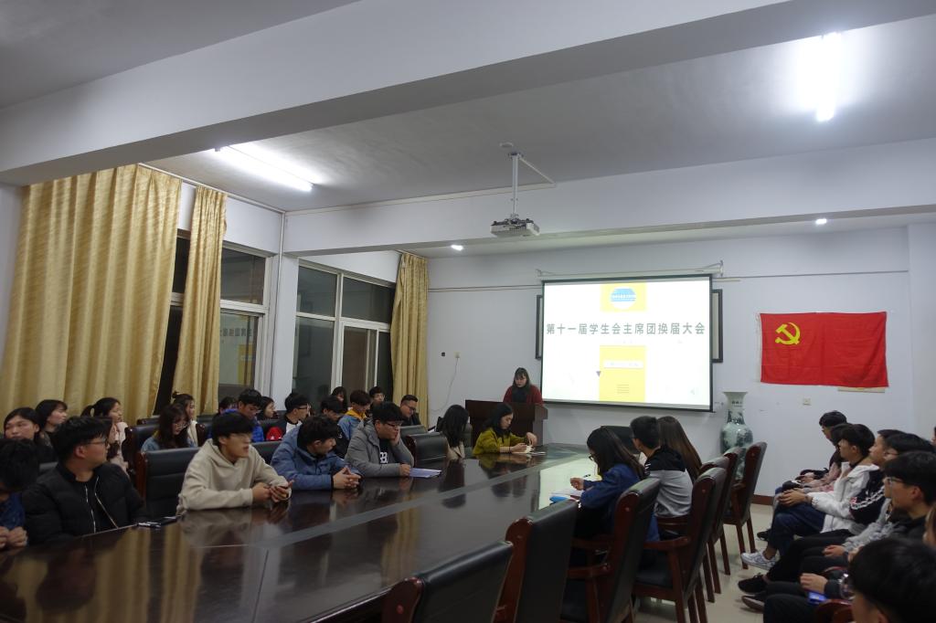 2019年3月5日晚上7点,我院在A14-221举行了第十一届学生会主席团换届大会,此次换届大会由主席团成员侯以敏主持,我院团总支书记孟一老师以及各位辅导员老师、第十一届学生会主要成员及部分18级班委出席了此次会议。