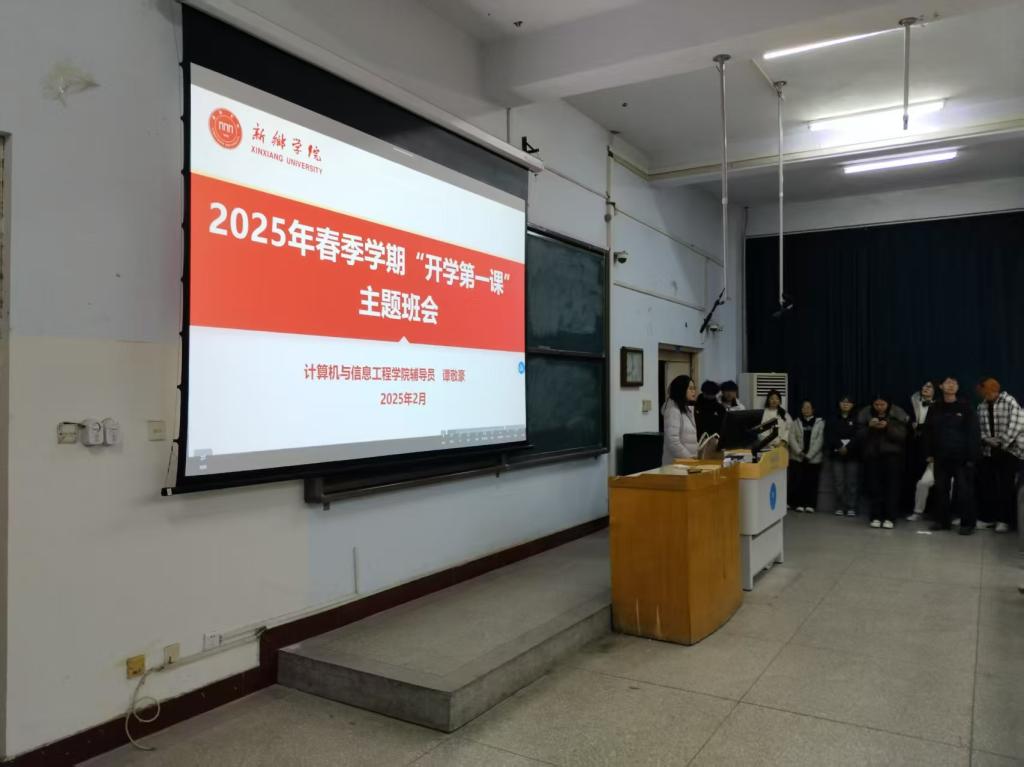 为了引导学生以饱满的热情投入新学期,进一步加强纪律严明的学风建设,提高同学们的安全意识。2月18日晚19:00,2024级计算机类2班、3班、4班和2024级人工智能1班在A01-119教室举行了以“开学第一课”为主题的班会活动。此次活动深受同学们重视,不仅体现在四个班共300余人无一缺席与迟到,还体现在300多双眼睛自始至终汇聚于讲台中心。