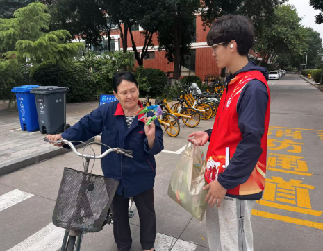 带着作品的志愿者们穿梭在校园里,将祝福送到保安叔叔、医护阿姨、保洁师傅的手中。收到礼物的工作者们眼角弯成了月牙:“孩子们有心了!”他们的笑容比夏日的阳光更灿烂,而一句“学业顺利,平安健康”的叮嘱,也让志愿者们感受到满满的关爱与温暖。