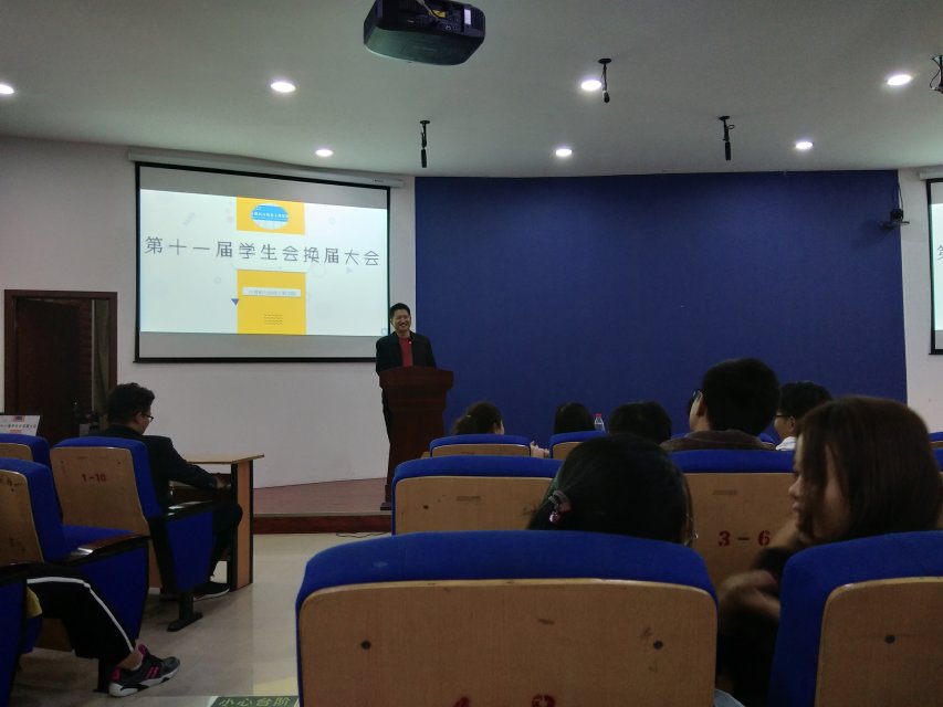 2018年10月16日晚上7点,我院在A05-105举行了第十一届学生会换届大会,此次换届大会由团副张琳主持,院系党总支副书记汤沛,团总支书记孟一老师以及各位辅导员老师、第十届学生会主要成员及部分18级新生出席了此次会议。