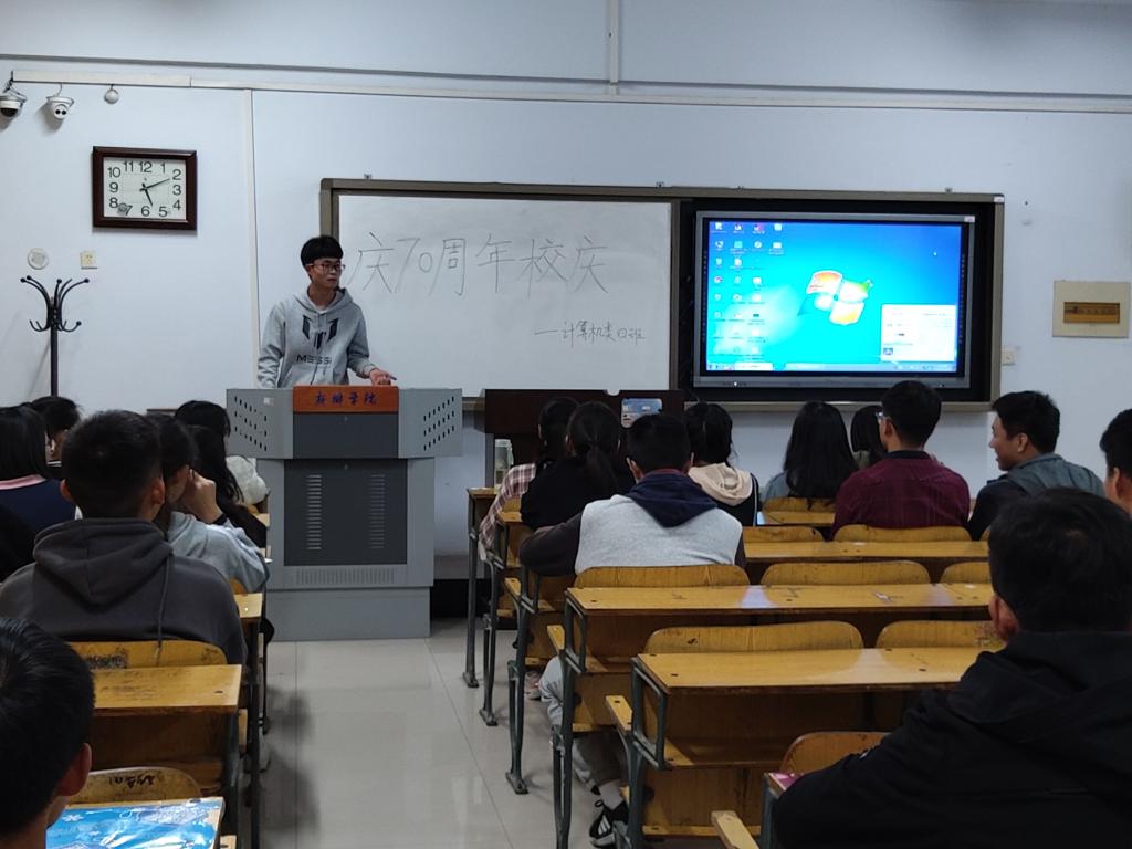 为了庆祝太阳tyc151cc七十周年校庆,让同学们更好的了解我们的学校,充分将我们的校史深入每个同学的内心,2019年10月25日我院19级计算机类4班全体成员在A14-219举行主题为“庆七十周年校庆”的团日活动!