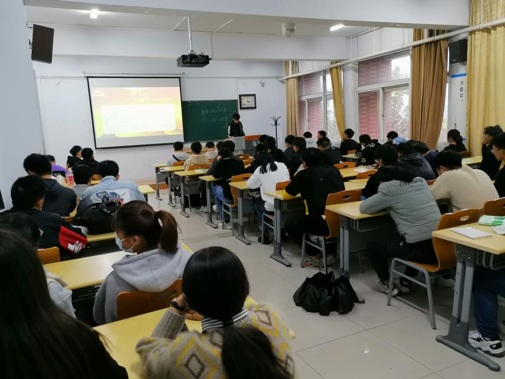活动伊始,由宣传委员梁宏帅通过精美的PPT向同学们讲述了党史、社会主义发展史、新中国学习史以及改革开放史,使同学们对新中国的光辉历程有了更深的认识。随后,同学们对“青春研学四史·牢记初心使命”这一主题进行讨论,并由学生代表盈倩倩同学上台发言,她表示作为新时代中国青年要积极传承红色基因,树立理想信念和对中华民族伟大复兴中国梦的信心。最后,宣传委员梁宏帅以小故事的形式为大家讲解了红色政权来之不易、新中国来之不易、中国特色社会主义来之不易。