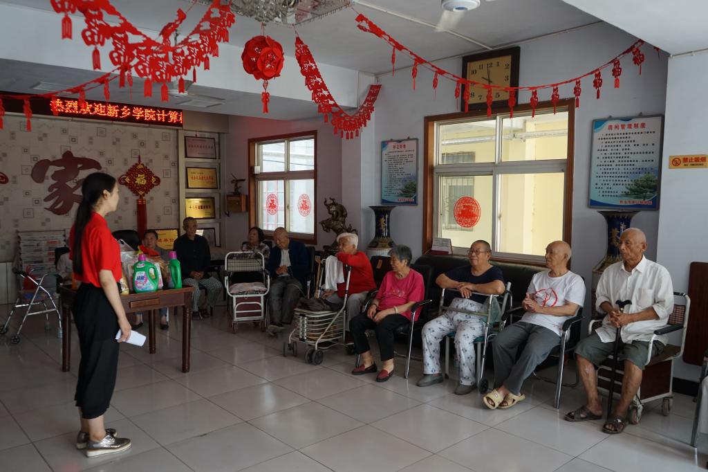 在工作人员的安排下,志愿者们礼貌地进行自我介绍,分享来到颐养院的体会,并为老人们带来才艺表演。一番欢笑后,志愿者们开始为老人们发放自发购买的水果、生活用品,有位老人开心的说:"下次不要破费了,其实只要你们来我们就很开心了!"这句话不禁让实践团成员们感到既温暖又心酸。老人们亲切地向志愿者分享自己的故事、介绍自己的家庭、诉说心中的苦闷,无一不透露着对子女的思念·······志愿者作为忠实的听众,为老人们送去了温暖,并对老人作了相关问卷调查,了解老人心理健康状况。接下来,在负责人的指导下,女生们在厨房里为老人包饺子,做爱心午餐,男生们搀扶老人上车,为老人前往凤凰山作准备。看到老人们灿烂的笑容,听到老人们爽朗的笑声,志愿者们充分体会到了本次志愿活动的意义所在——弘扬志愿精神,关注老年群体。