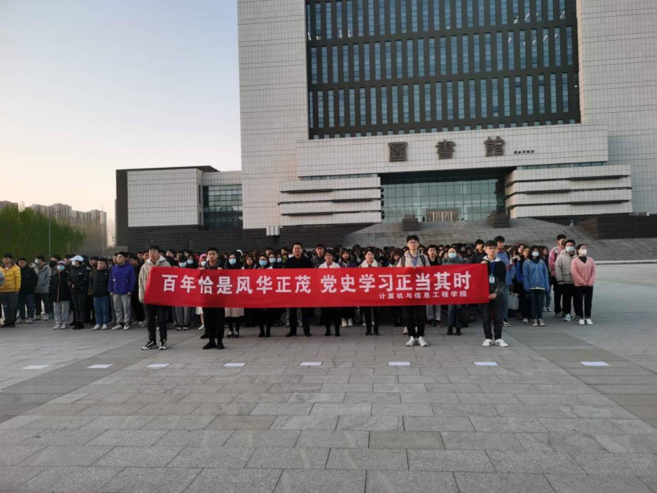 升旗仪式于6:50开始,同学们已经按预先安排好的位置在图书馆新国旗广场整齐列队,国旗护卫队队员托举着国旗铿锵走来,一切准备就绪。随着主持人的一声“升国旗仪式正式开始,全体肃立!”鲜艳的五星红旗随着庄严的国歌冉冉升起,全体师生行注目礼。升旗结束后,计信学院19级学生代表张文秒进行国旗下的演讲,讲话的主题是《国旗下的党史》,诉说了大家信心满怀地迎接祖国明天的心声,表明自己对国旗的热爱与责任担当——“火红的党旗永远飘扬!”。接着,由第十二届国旗护卫队队员朱超慧进行讲话,以《回眸党史,感恩今天》为主题,号召大家铭记党史,感恩今天的美好生活来之不易,为中华崛起而读书!
