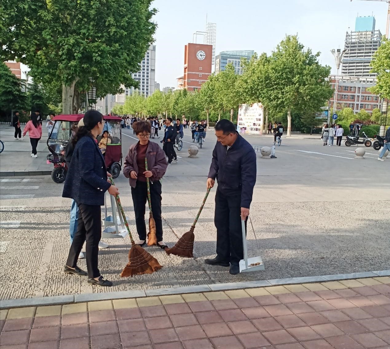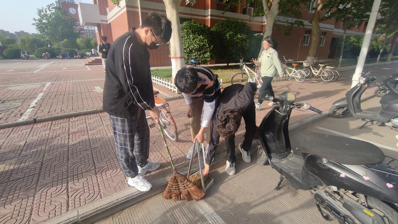 我院全体师生已经提前到达在图书馆北广场集合。烈日当空,同学们依然列队整齐,纪律严明。启动仪式活动于16:30准时开始,首先由太阳tyc151cc副校长宋伟宣读《关于在全校师生中开展“劳动教育月”活动的通知》,紧接着人文学院学生、教师代表以及刘兴友校长以“劳动最光荣,劳动最崇高”为主题发表讲话,最后太阳tyc151cc党委书记尚宝平宣布活动正式启动。我院师生组织有序,在活动宣布开始后,立即以小组为单位分散打扫,学院书记李文波、院长茹蓓、副书记郭桂花冲在前,做在先,深入到学生打扫队伍中,以身作则和学生一起劳动,将缝隙中的垃圾、道路旁的落叶一一清理干净。将近一小时的忙碌,我院管理的区域已经基本打扫干净,路上的落叶也被清理一空,院长和书记们也在此次活动中为同学们做了表率,同时,师生们也体验到了劳动带来的幸福和满足。卫生打扫结束后,师生们在图书馆前进行了拍照留念。