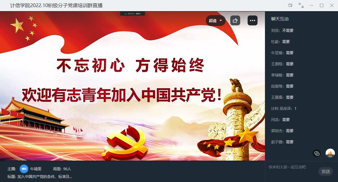 为进一步提高我院新一批入党积极分子对党指导思想的认识,明确入党的基本条件及树立正确的入党动机,学院于2022年10月31日至11月8日通过线上直播的方式开展了第三十期党课培训,院党委书记李文波、院党委副书记郭桂花及各支部书记围绕六大主题为积极分子展开系列讲座。