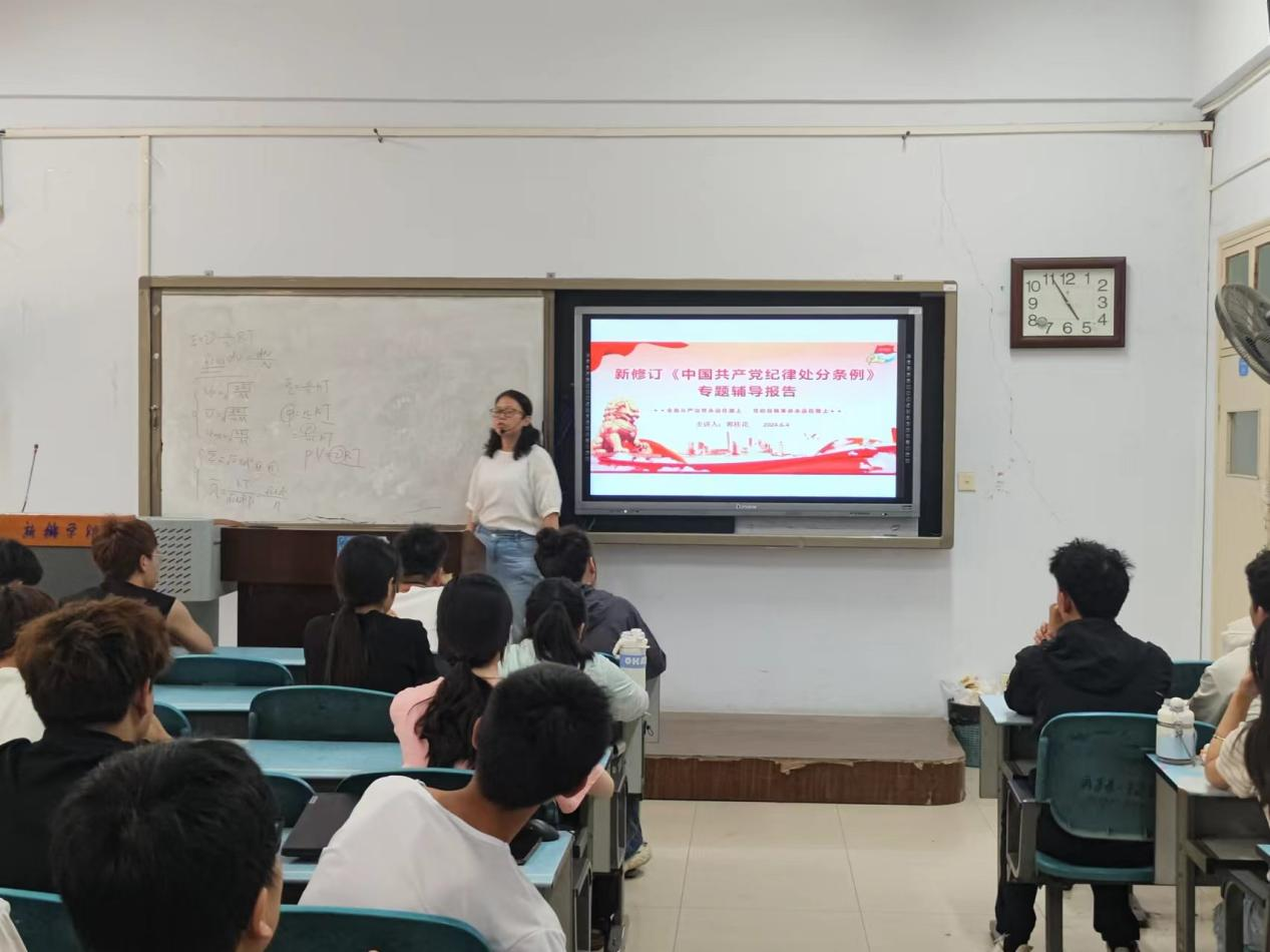 为了认真学习贯彻习近平总书记关于党纪学习教育的重要讲话和重要指示精神,引导广大学生党员、积极分子对《中国共产党纪律处分条例》的理解,我院于2024年6月4日开展“纪检委员讲《条例》”党纪学习教育工作,本次辅导报告由学院党委副书记郭桂花主讲,学院学生党员和积极分子参加。
