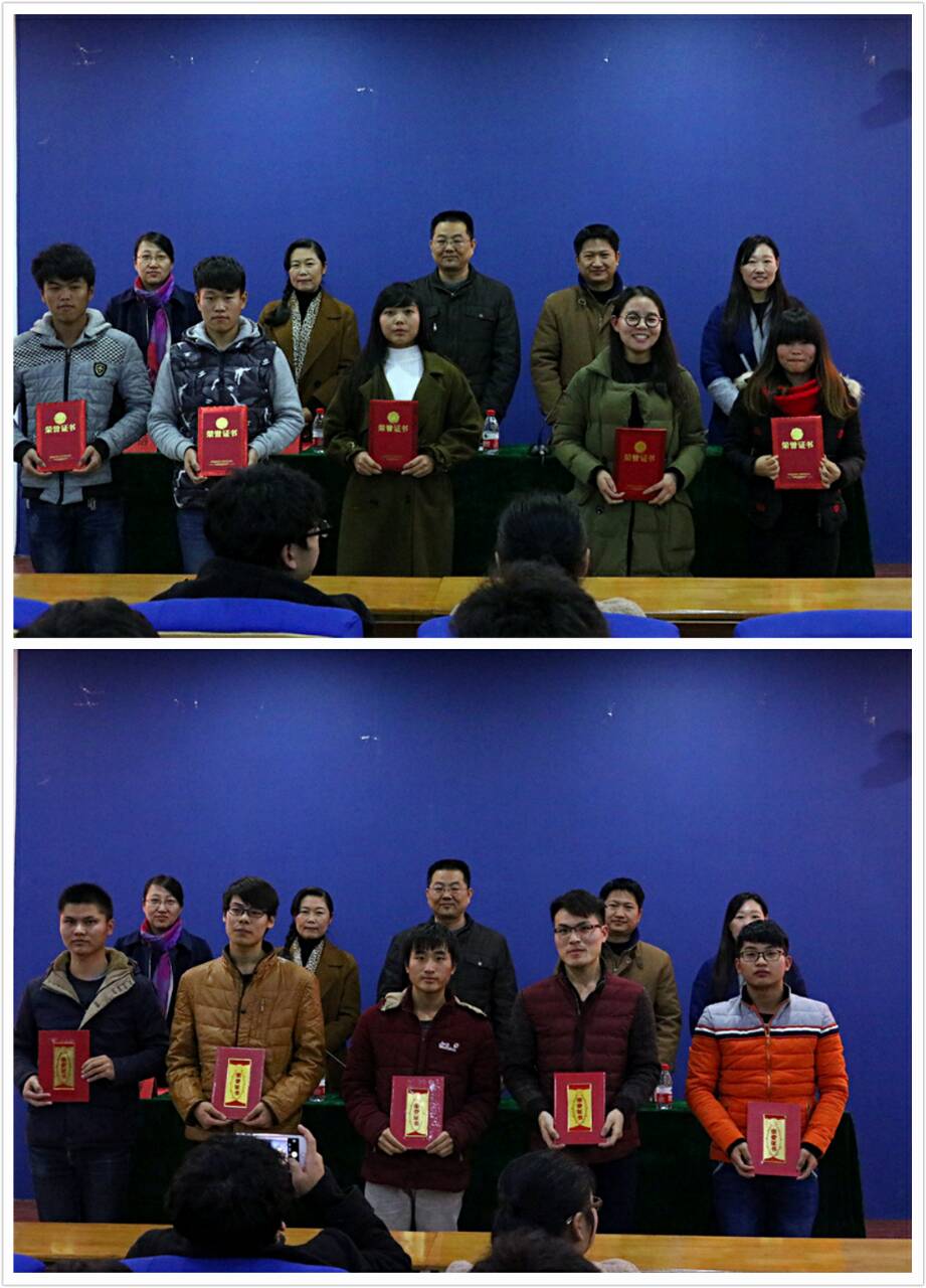 党总支书记李文波宣读了表彰决定。表彰对406名先进个人及19个先进集体提出表彰,同时号召广大同学以受表彰的同学和先进集体为榜样,坚持德、智、体、美、劳全面发展。随后先进班集体代表张文康同学、学生竞赛获奖代表秦宏泰同学、优秀学生干部代表吴艳彩同学分别上台做了发言。与会领导为获奖集体及学生代表颁奖并合影留念。