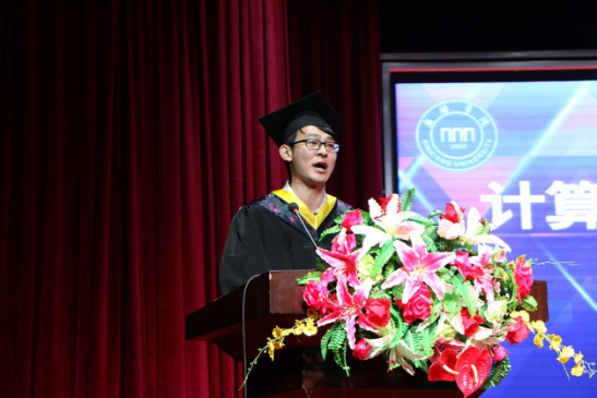 随后,教师代表朱楠、毕业生代表郑长君同学依次上台发言。朱楠老师表达了对毕业生的殷切期盼和美好祝福;郑长君同学回顾了四年大学生活,深切表达了对学校、老师的感激之情和对同学、朋友的不舍之情,以及即将踏入社会的坚定信心和回馈母校的决心。仪式的最后,校领导与学院学位委员会成员为全体毕业生发放学位证书,援正流苏并合影留念。