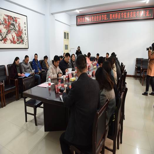 2017年12月21日上午,郑州师范学院信息科学与技术学院院长胡明生、副院长李正超、 副院长蔡遂民一行8人,来我院进行了关于本科合格评估及专业人才培养方案等方面的探讨交流。我院潘红院长、李文波书记、高雪霞副院长、汤沛副书记、教学秘书、4名教研室主任参加了座谈交流。