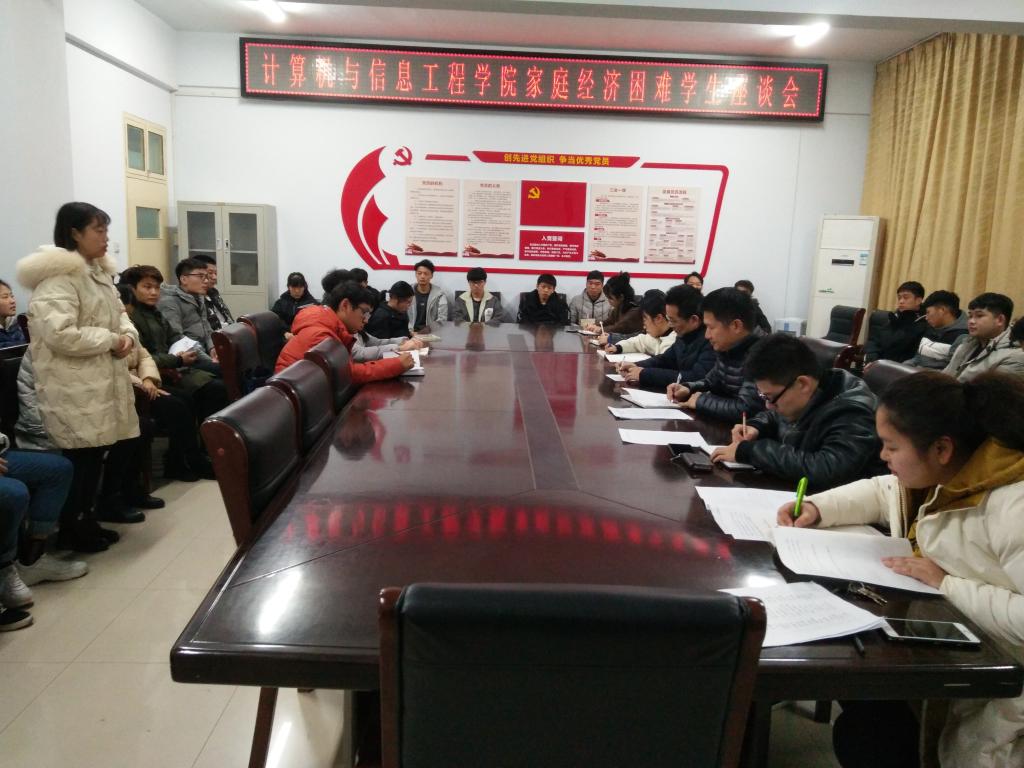 为了解家庭经济困难学生在校学习、生活的情况,宣传国家和我校各类资助政策,充分听取学生对资助工作的意见和建议,按照我校《关于在全校范围召开2018年家庭经济困难学生座谈会的通知》要求,结合我院实际,于2019年1月3日下午在A14楼会议室召开了“为梦想插上翅膀”为主题的家庭经济困难学生座谈会,各年级各班级困难生代表参加了此次会议,会议由党总支副书记汤沛主持,党总支书记李文波、资助专管员和辅导员老师出席此次座谈会。