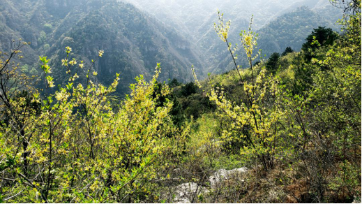 乱花渐欲迷人眼,山路崎岖有客来。迎着清凉的山风和满眼的翠色,我们沿着天柱沟,走入大山的怀抱。拓展的前半程,我们穿梭在崇山峻岭之间,峰回路转,柳暗花明,沿途奇峰俊秀、松林苍翠,满山黄色的连翘花盛开,偶尔点缀一些山桃花,美不胜收。老师们平时耕耘于三尺讲台,疏于锻炼,行进速度逐渐放慢,但大家一路兴致高昂,欢声笑语,相互照应,彼此鼓励,坚决不让一个人掉队。经过了将近三个小时的攀爬,我们终于到达了途中的补给点。
