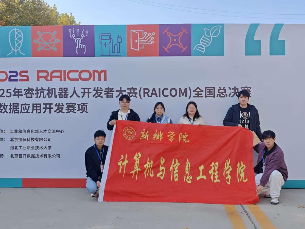 11月15日,2025年睿抗机器人开发者大赛(RAICOM)大数据应用开发赛全国总决赛在河北石家庄市河北工业职业技术大学揭开序幕,我院孔祥盛、牛靖雯老师带领曹富强、杜琳洁、李琛、吴俊磊、李旭阳五位学生以个人赛形式参赛,通过努力拼搏,全员获奖,获得国赛一等奖1项(曹富强)、二等奖1项(杜琳洁)、三等奖3项(李琛、吴俊磊、李旭阳),牛靖雯老师获“优秀指导教师”称号,以优异的表现和扎实的专业能力,为学校再添荣誉。