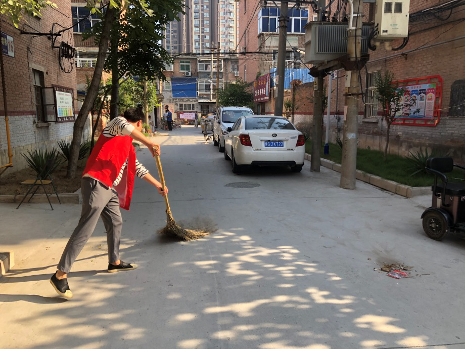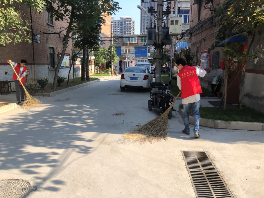 2020年8月29日清晨,我院志愿者服务队前往学校帮扶社区--牧野区统建楼开展志愿清扫活动。本着“全覆盖、无缝隙”的工作要求,我院服务队分成三组对该区域各个院落进行逐一清洁,队员们扫落叶、捡烟头、清理建筑垃圾,从清晨干到中午,每位队员额头都挂着豆大的汗珠,清扫过程中有留守老人送来清甜的矿泉水和亲切的慰问,有留守儿童向队员们行少先队礼,队员们倍感欣慰干劲十足。